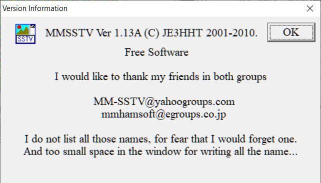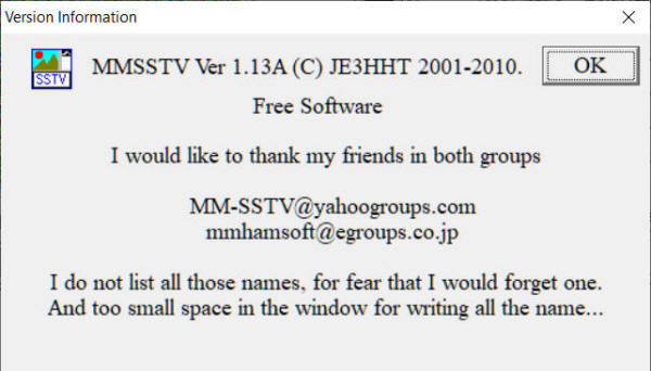 MMSSTV © 2001-2011 by Makoto Mori, JE3HHT ****************************************** Part of the YONIQ code © 2020 by EA1IMW under the same terms ****************************************** YONIQ has been created from the modification of part of the source code provided from "Github" under "GNU Lesser Public General License" and the creation of new code, as indicated from "http://mm-open.org/". In addition, respecting the license, the complete YONIQ code can be downloaded from the original YONIQ download website. ****************************************** Any questions related to YONIQ should be made only through the email "YONIQ@evl.es" ****************************************** MMSSTV 1.13 YONIQ - February 8, 2020 ************************************* © 2020 by EA1IMW Eugenio Fdez MMSSTV 1.13a FULL - September 29, 2010 ************************************* © 2001-2012 by JE3HHT Makoto Mori Translated into English by JA7UDE Nobuyuki Oba For more information about MMSSTV and the use of the program see: From the program Help Menu -------------------------- - MMSSTV Help - MMSSTV.TXT (Basic operations) - Version-up information From the Windows program Start Menu or Program Folder ----------------------------------------------------- - MMSSTV Help (MMSSTV.CHM) - Basic operations (EMMSSTV.TXT) - MMSSTV FSKID (FSKID.TXT) - MMSSTV Repeater Mode (REPEATER.TXT) - New SSTV Modes (MODE.TXT) - Revision History (EUPDATE.TXT) - Readme.txt - License.TXT - Terms.txt Please send comments and questions to the MMSSTV Yahoo Group http://groups.yahoo.com/group/MM-SSTV =============================++++++++++++++====== Release notes: MMSSTV Help ---------- A, updated help, from Russ - WL7LP, is included with this release. The help file is now in the new Microsoft CHM format. Please report any suggestions or help problems to Russ in the MMSSTV Yahoo group. **A special thanks Russ providing the new updated help file. (The following was Canaged/Updated in ver 1.12) - The sound card selection scheme changed. This makes it easier to select the correct sound card device. - Soundcard Output Level works on Vista and Windows 7. - Soundcard Input Level works on Vista and Windows 7. - Updated the duplication check routime of JASTA contest. =================================== If you have a previous version of MMSSTV you should install this version in the same folder to retain your setup information and pictures. .............................................. This release uses Inno Setup version 5 (Innovative Setup) a Freeware installer. http://www.jrsoftware.org This is a "Freeware" installer - more fitting for distributing Freeware software! .............................................. To Uninstall MMSSTV: Should you ever want to remove MMSSTV from your computer. You can Delete MMSSTV, Using the Windows "Add/Remove Programs" or by clicking on "Uninstall MMSSTV" in the windows [Start] Programs menu. Uninstalling MMSSTV will remove the program, shortcuts and registry entries. It will leave the MMSSTV folder, with a sub-folder, that were not created by the install program. Leaving this on your computer will not cause any problems. If you are short of hard drive space or just what to clean things up, just delete the MMSSTV folder.. ------------------------------------------ About the MM Hamsoft Programs and Website ========================================= I package, released and made the MM programs available for free. I provide the MM Hamsoft Website as a free service to users at no direct cost. Money to pay for operating the MM Hamsoft - http://hamsoft.ca comes from advertising revenue and donations from a few much appreciated users. If you would like to help, please click "Donations" on the MM Hamsoft website for more information. Disclaimer: Although all possible effort has been put into testing and check this install process, I except no responsibility for problem that may occur and/or cause undesirable results from using this installer. In simple terms: Everything worked just fine in all my tests but computers being what they are one can never know what things can happen. It is very unlikely that you will experience any problems but occasionally things go wrong.. 73 - Ken - VE5KC - MM Hamsoft - http://hamsoft.ca - VE5KC - http://ham-radio.ca - Amateur Radio Link - http://amateur-radio.ca ---- |