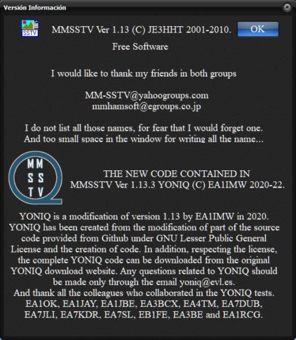 MMSSTV © 2001-2012 by Makoto Mori, JE3HHT ****************************************** Part of the YONIQ code © 2020 by EA1IMW under the same terms ****************************************** YONIQ has been created from the modification of part of the source code provided from "Github" under "GNU Lesser Public General License" and the creation of new code, as indicated from "http://mm-open.org/". In addition, respecting the license, the complete YONIQ code can be downloaded from the original YONIQ download website. ****************************************** Any questions related to YONIQ should be made only through the email "YONIQ@evl.es" ****************************************** TERMS of USE ============ MMSSTV is distributed as Freeware and is free for personal use. No person shall use or distribute this program in any way to make a profit. It is to be a free program in compliance with the wishes of the author. The World Wide Copy Right is held by Makoto Mori - JE3HHT. Users of this program are asked to comply with the following: ALL comments, bug reports, requests for help... etc. MUST be handled through the MMSSTV Yahoo Group... Members of the beta/help team as well as Mako - JE3HHT, the author are reading the messages on the list server. DO NOT send e-mail directly to JE3HHT, the webmaster of the MM Hamsoft Website or members of the beta/help group. Check on the website and Yahoo groups for the latest information. MM Hamsoft Web Site - http://hamsoft.ca MMSSTV Users Group - http://groups.yahoo.com/group/MM-SSTV -------------------------------------- |